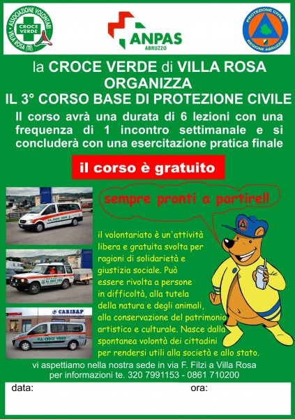 La P.A. Croce Verde organizza il 3° Corso Base di Protezione Civile che avrà inizio il 22 Ottobre alle ore 21.00.